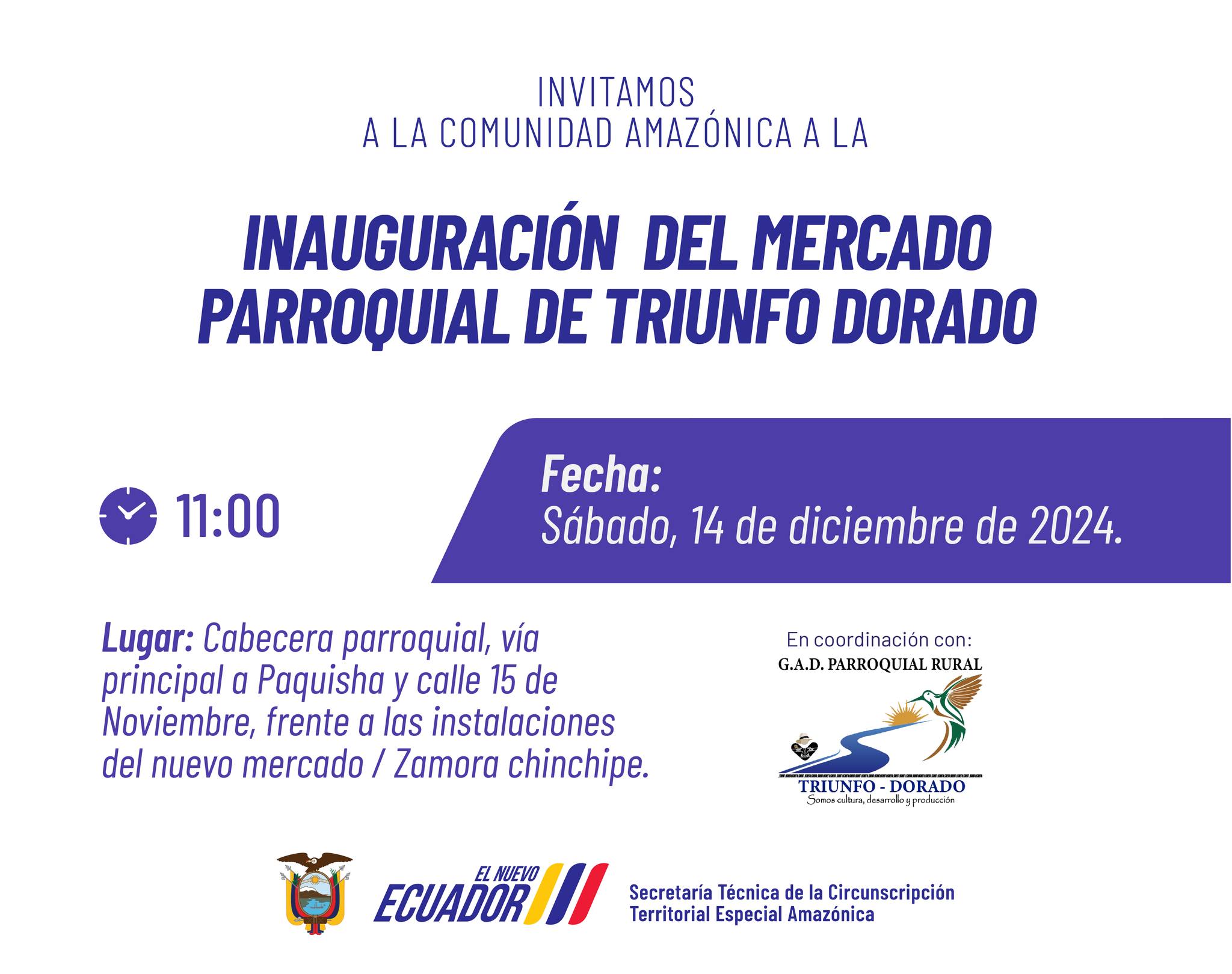 Secretarรญa Tรฉcnica de la Amazonรญa invierte recursos que se transforman en obras en toda la Amazonรญa. Es un placer invitarles a ser parte de la inauguraciรณn del nuevo mercado para la parroquia Triunfo Dorado, en la provincia de Zamora Chinchipe
